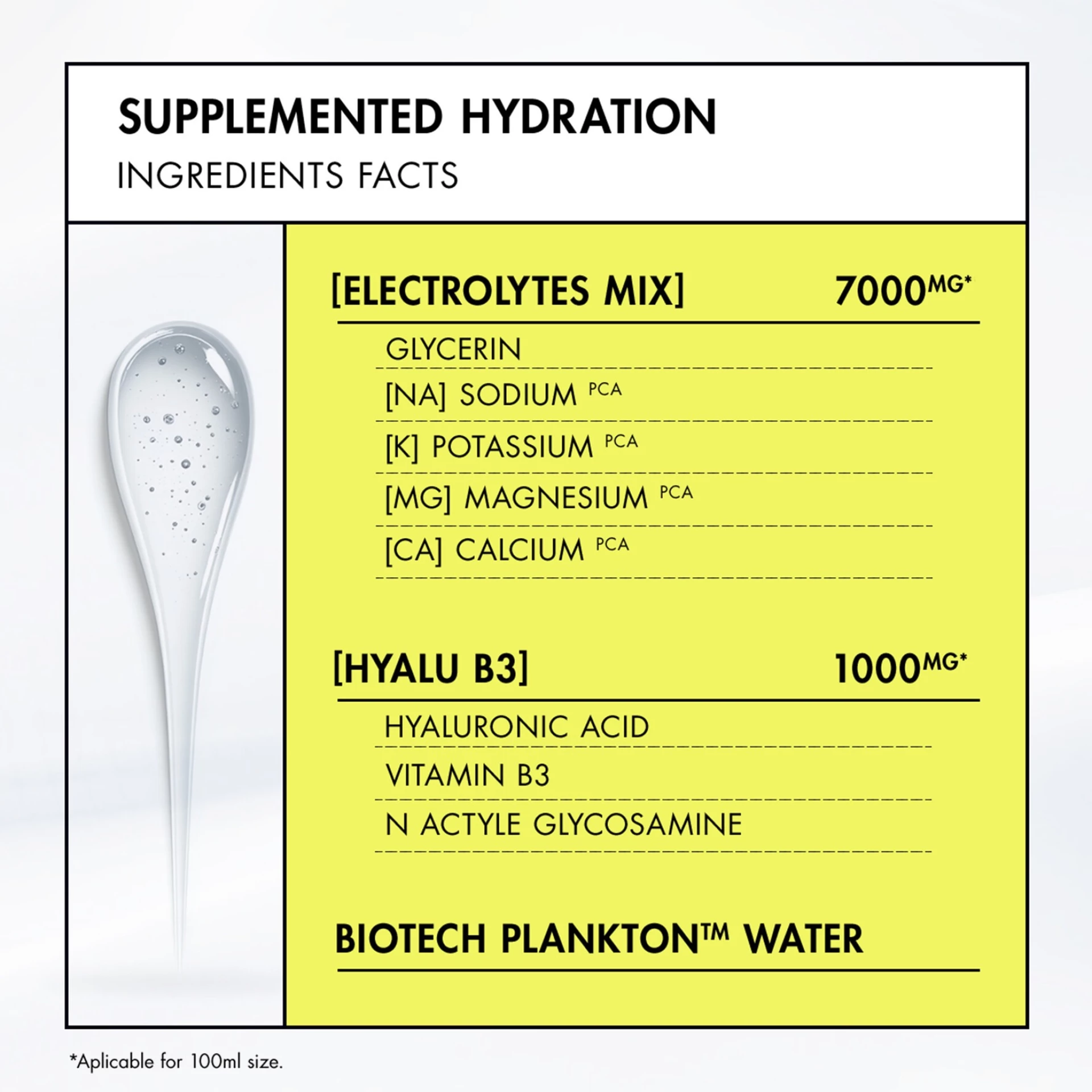 863755 40 - INGREDIENTS: AQUA / WATER / EAU • GLYCERIN • PENTYLENE GLYCOL • PEG-20 • POTASSIUM PCA • CARBOMER • NIACINAMIDE • CALCIUM PCA • PPG-6-DECYLTETRADECETH-30 • SODIUM HYALURONATE • SODIUM HYDROXIDE • SODIUM PCA • ADENOSINE • MAGNESIUM PCA • CAPRYLYL GLYCOL • VITREOSCILLA FERMENT • TRISODIUM ETHYLENEDIAMINE DISUCCINATE • ACETYL GLUCOSAMINE • ETHYLHEXYLGLYCERIN • TOCOPHEROL • LIMONENE • CITRAL • CITRUS AURANTIUM PEEL OIL • CITRUS LIMON PEEL OIL • CARVONE • PARFUM / FRAGRANCE (F.I.L. N70063628/1).