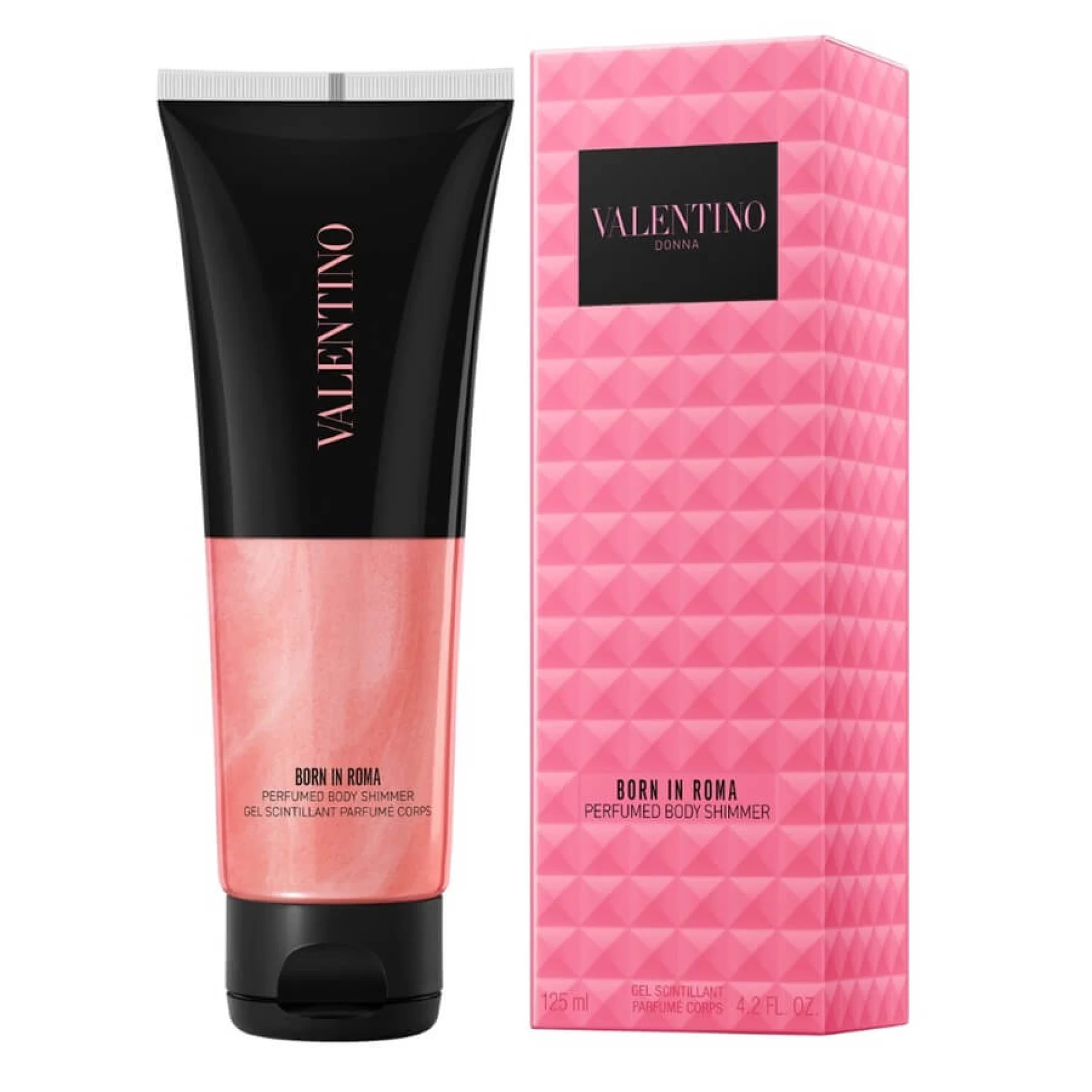 Svjetlucavi, hidratizirajući proizvod za tijelo s mirisom Born in Roma Donna za blistav sjaj cijelog tijela. Valentino Beauty Born in Roma mirisni shimmer za tijelo luksuzni je hibridni proizvod tri u jedan koji besprijekorno spaja šminku, njegu kože i miris. Ovaj inovativni shimmer uljepšava vašu kožu zavodljivim sjajem, dok vas istovremeno obavija kultnim mirisom Born in Roma Donna. Više od samog shimmera, on također pruža učinkovite benefite za njegu kože, zahvaljujući hijaluronskoj kiselini za dubinsku hidrataciju i RomaLight kompleksu za dugotrajan, blistav sjaj. Lagana, lako razmaziva formula klizi po koži, ostavljajući je mekom, glatkom i suptilno mirisnom. Delikatne svjetlucave čestice prekrasno hvataju svjetlost, stvarajući višedimenzionalni sjaj koji naglašava vaš prirodni sjaj. Bilo da se pripremate za posebnu prigodu ili jednostavno želite dodati dašak glamura svojoj svakodnevnoj rutini, Born in Roma mirisni shimmer za tijelo savršen je način da podignete svoj izgled i razmazite svoja osjetila. Praktično pakiranje, ukrašeno prepoznatljivom Born in Roma ružičastom nijansom na elegantnoj crnoj podlozi, čini ga elegantnim dodatkom vašoj kolekciji ljepote.