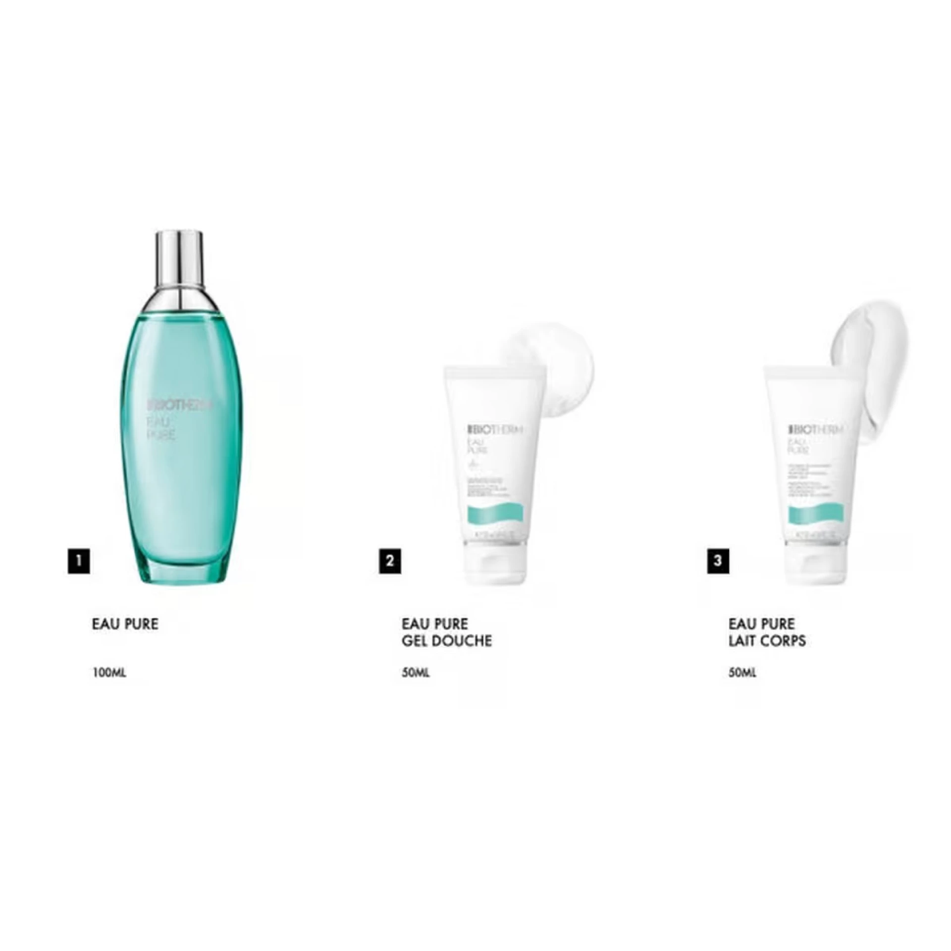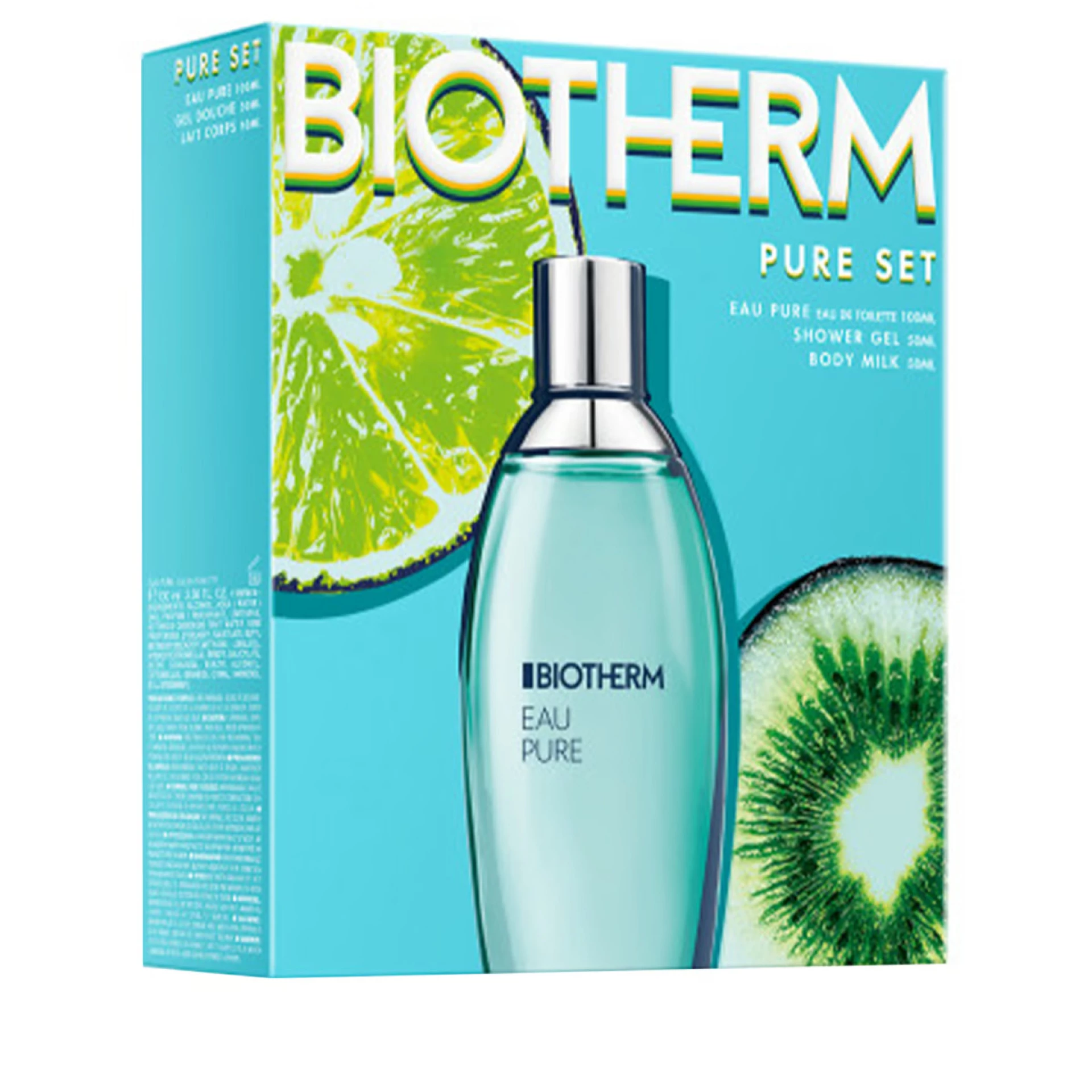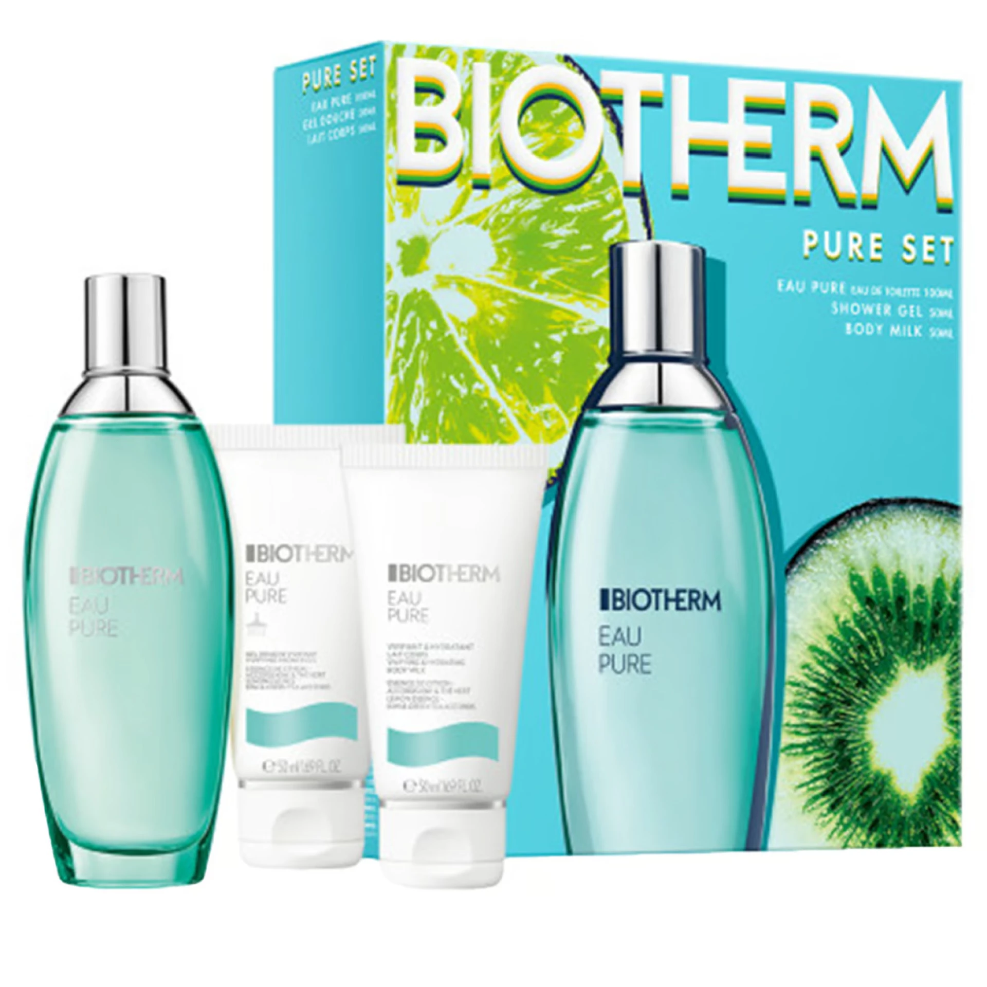 Eau Pure poklon set sadrži: • Eau de Toilette (100 ml) • Gel za tuširanje (50 ml) • Mlijeko za tijelo (50 ml) Eau Pure Eau de Toilette Ova toaletna voda osnažuje i osvježava vašu kožu mirisom zelenog voća i biljaka, poput kivija, limete, rabarbare i zelenog čaja. Srednja nota otkriva cvjetne tonove jasmina, lotosovog cvijeta i katananca (rezede). Eau Pure gel za tuširanje Svjež i lagan gel za tuširanje s esencijalnim uljima nježno čisti i njegu kožu. Nakon upotrebe, koža je očišćena, revitalizirana i mekana. Eau Pure mlijeko za tijelo Ovo mlijeko za tijelo s vitaminom E i esencijalnim uljima hidrira kožu i intenzivno je osnažuje. Lagana i osvježavajuća tekstura se brzo upija, ostavljajući za sobom vitalizirajući miris Eau Pure linije.