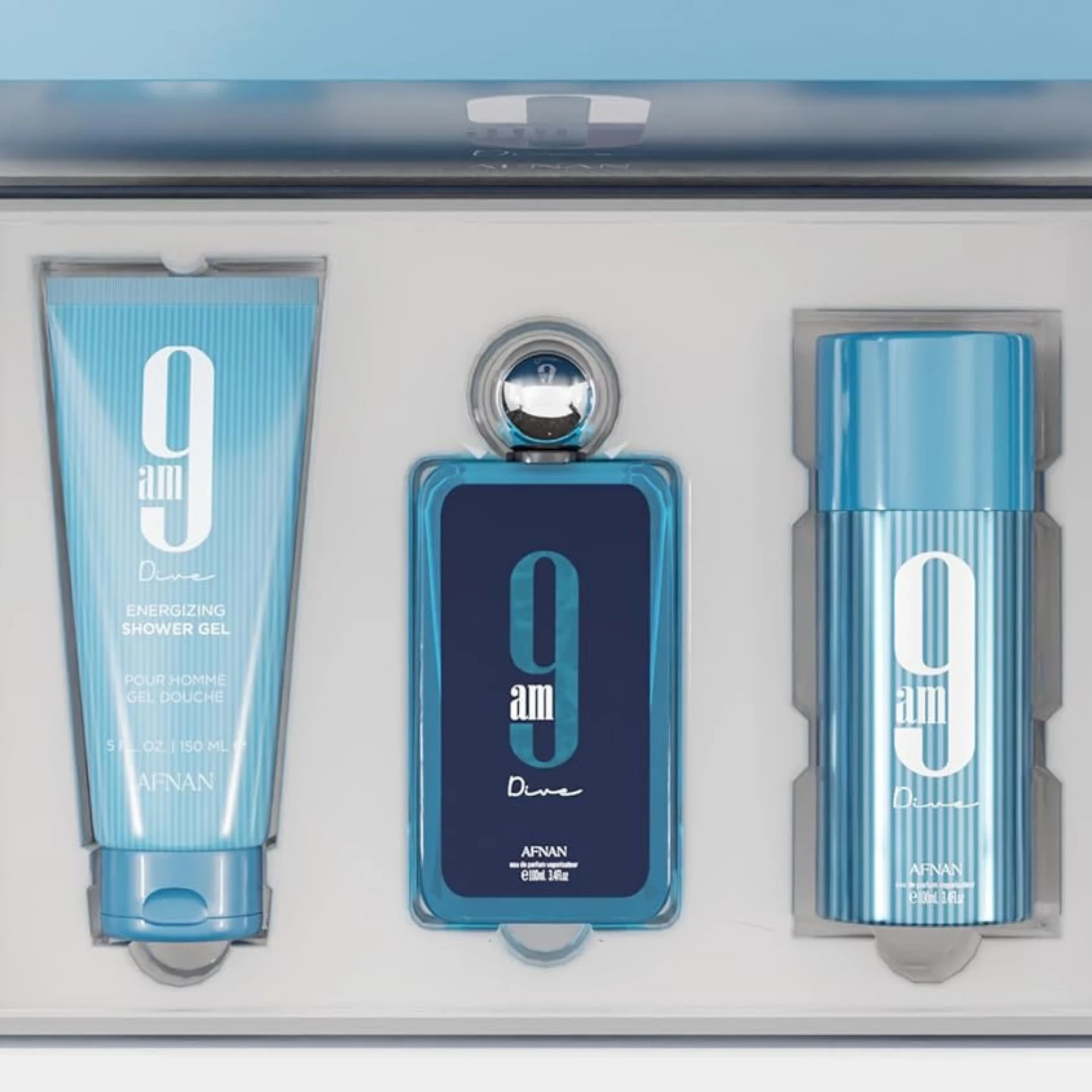 Afnan 9am Dive poklon set za muškarce Uronite u osvježavajuće iskustvo uz Afnan 9 AM Dive Eau de Parfum, miris za muškarce koji dočarava suštinu okrepljujućeg jutarnjeg skoka u kristalno čistu vodu. Miris se otvara energičnom mješavinom limuna, ružičastog bibera, mente i crne ribizle, koja trenutno budi čula. Srce mirisa otkriva harmoničan spoj jabuke, tamjana i kedra, dodajući mu dubinu i kompleksnost. Na samom kraju, bazne note pačulija, jasmina, đumbira i sandalovine pružaju topao i dugotrajan završetak.